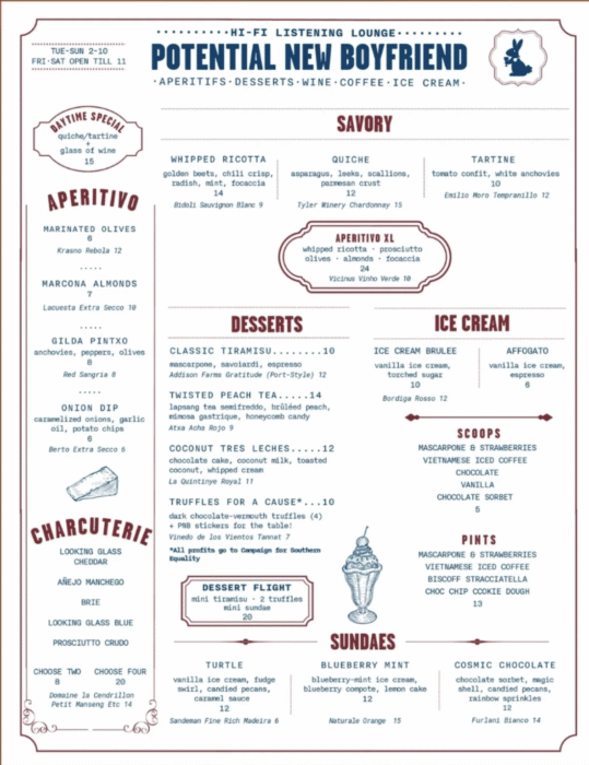 Whether you crave a post-dinner amaro, a sweet treat paired with a glass of wine, or just a peaceful moment with a great playlist and good company, Potential New Boyfriend promises an unforgettable evening in a truly unique Asheville setting.