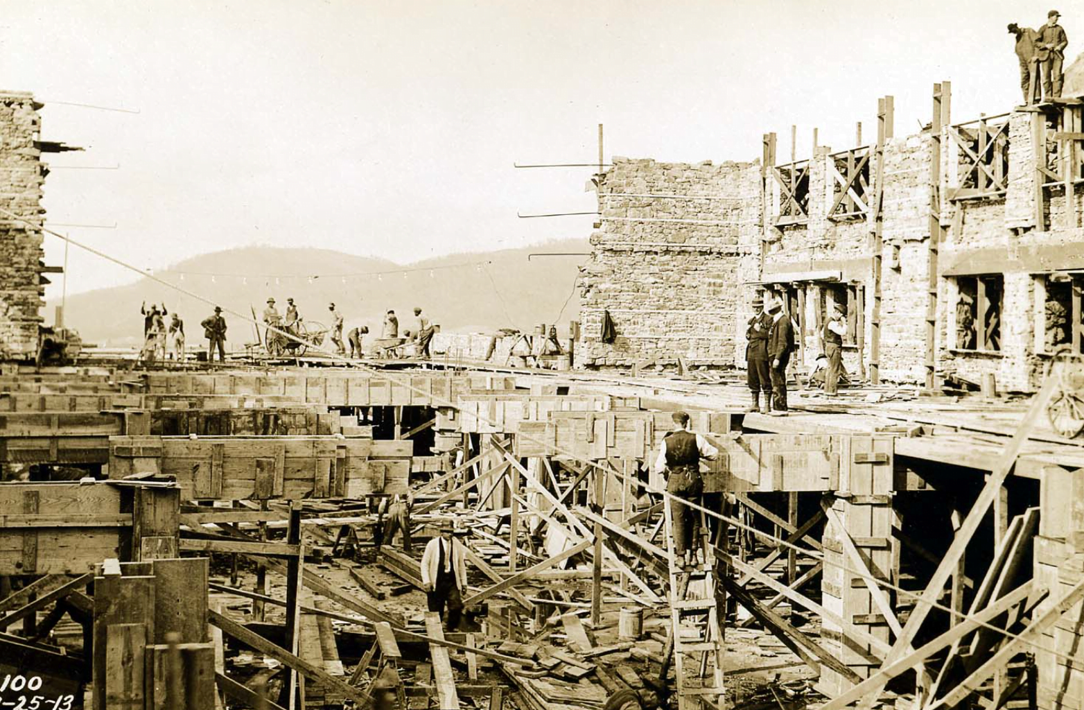 The Omni Grove Park is a historical resort hotel on the western-facing slope of Sunset Mountain Asheville, North Carolina. Built in 1913 with its distinctive undulating red clay tile roof, 5 foot thick, locally sourced granite walls. Four-hundred men worked 10-hour shifts six days a week. With only the use of mules, wagons and ropes, granite boulders, some weighing as much as 10,000 pounds, were hauled from Sunset Mountain to build the hotel.